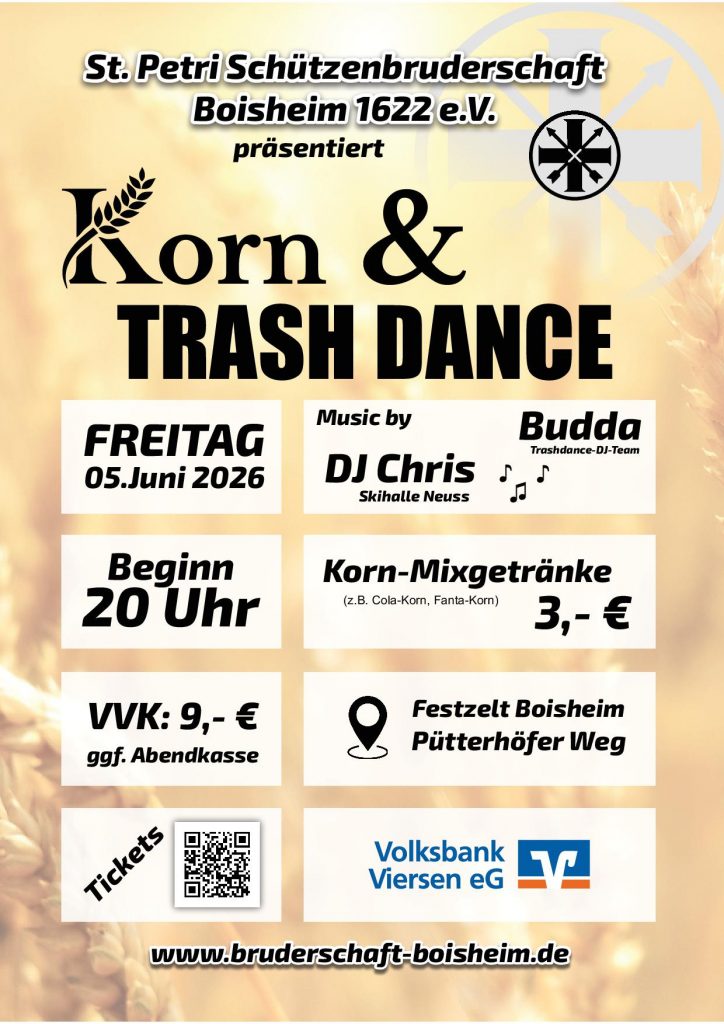 Nach dem überwältigendem Erfolg im Rahmen unseres Schützenfestes im letzten Jahr, werden wir auch in 2026 wieder mit Euch unter dem Motto „Korn & Trash Dance“ kräftig feiern.